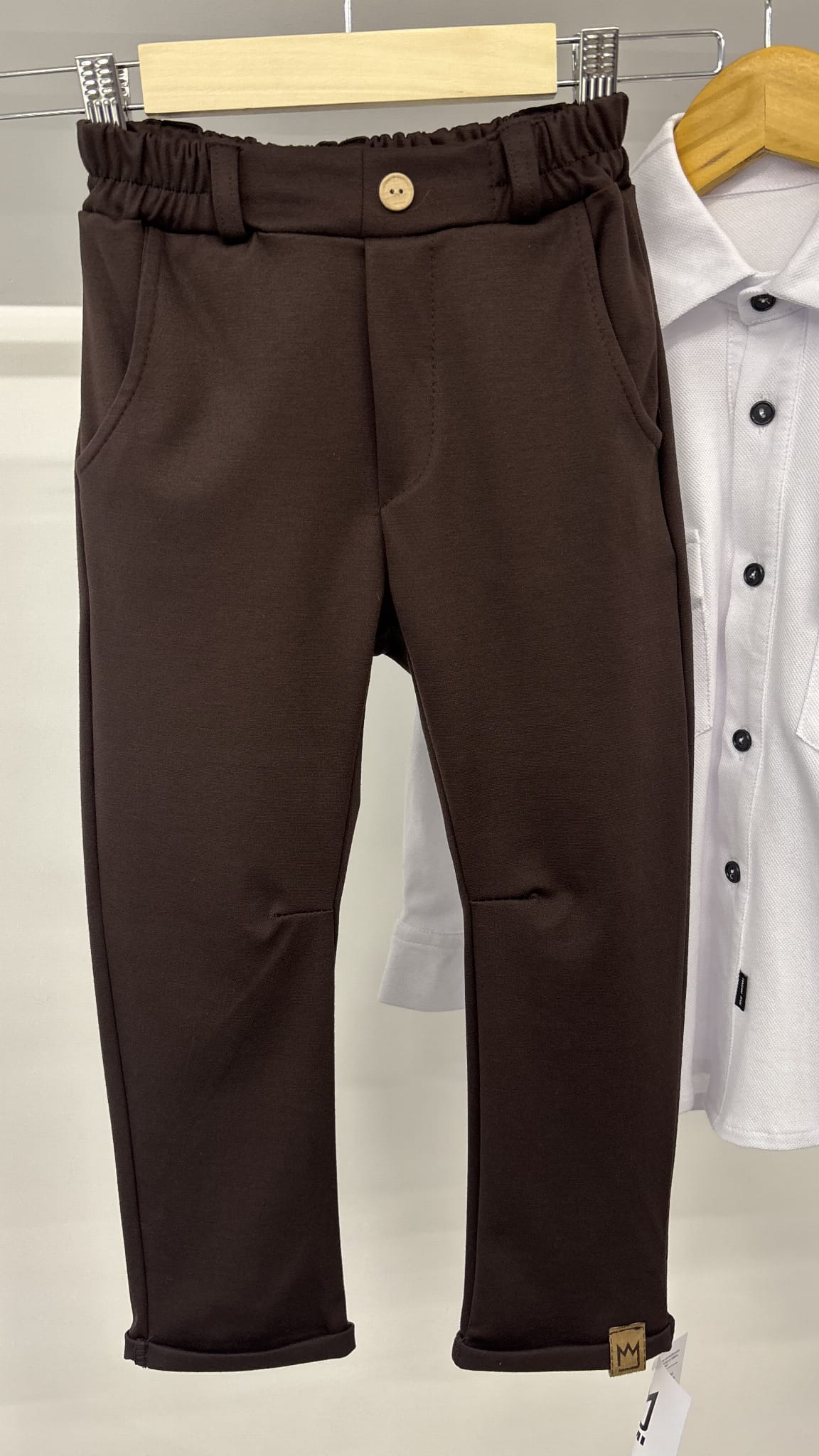 - Z przodu imitacja zamka i drewniany guziczek ( w zależności od dostawy - spodnie mają jeden lub dwa guziczki drewniane)